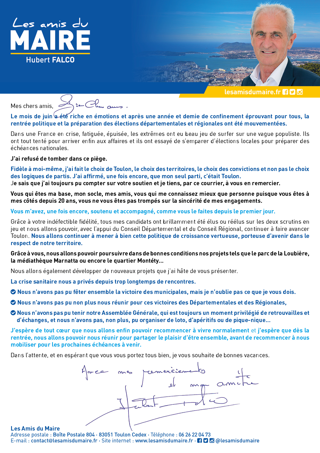 Été 2021 : La lettre d’Hubert Falco aux Amis du Maire