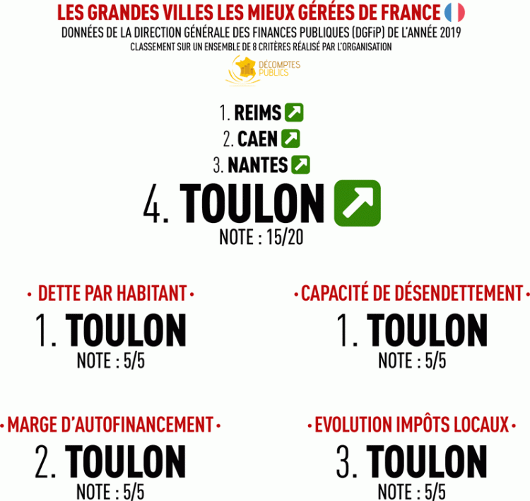 Notre belle Ville de Toulon a été classée 4ème grande ville la mieux gérée de France par M6 et Décomptes Publics à partir des données de la Direction Générale des Finances Publiques (DGFiP) avec une note globale de 15/20 derrière les villes de Reims, Caen et Nantes. Toulon est d’ailleurs la seule ville de la moitié sud de la France à figurer dans le top 10 de ce classement.
